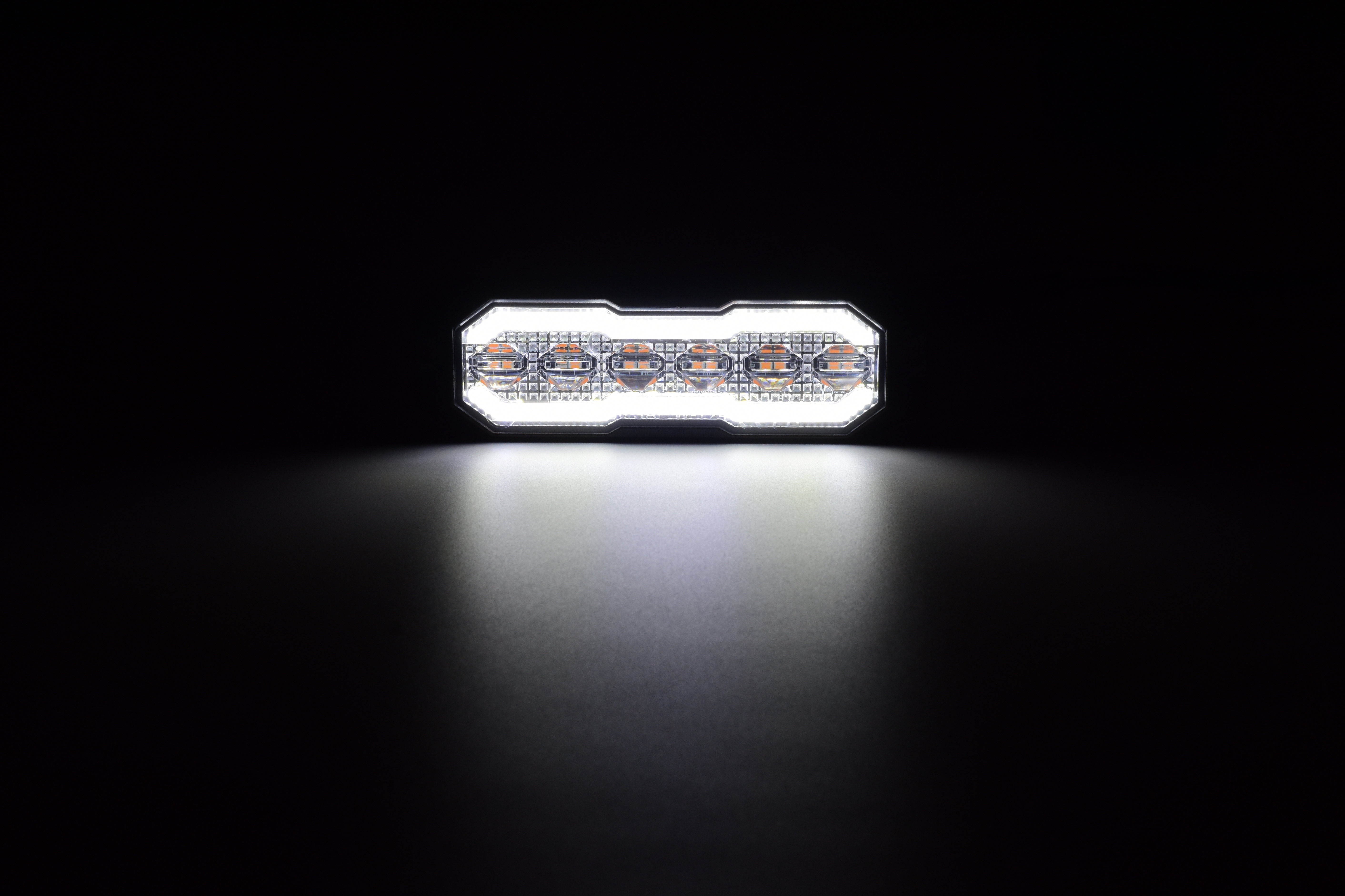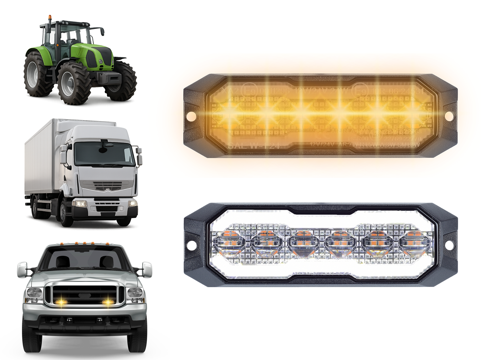 12 LED Frontblitzer orange mit Front-Positionslicht weiß, 24 W orange, bis zu 16 verschiedene Blitzmodi schaltbar, IP 6K9K, ECE R65 XA2, ECE R10, SAE 595, Klasse 1, 42 LED weiß als Frontpositionslicht, synchronisierbar, mit Memory Funktion, 12V/24V, zum anschrauben! robustes Aluminiumgehäuse, smoked Glas, Maße ca. LxBxH = 13x4x1,5 cm, XA2 E9 0011296, E9 10R-06 24531, SAE W-124
