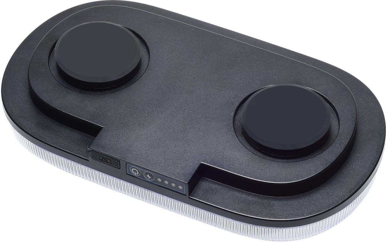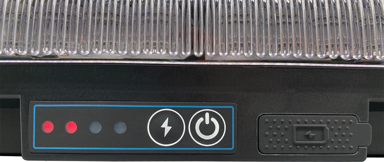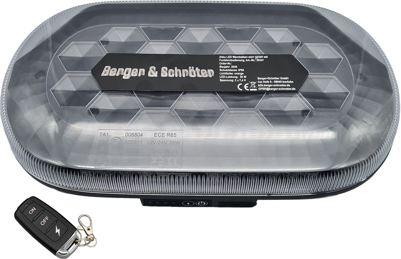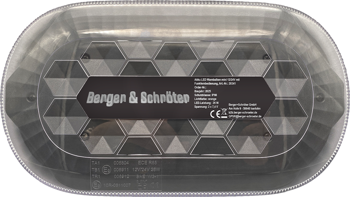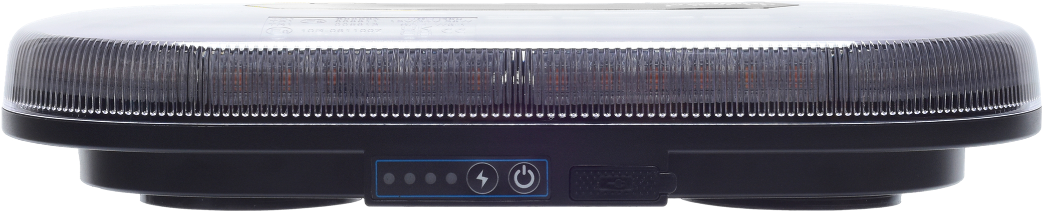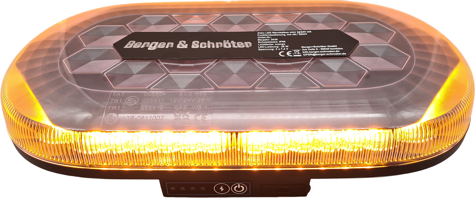 Akku LED Warnbalken Mini, Magnetfuß, 12/24V, mit Funkfernbedienung, Betrieb über eingebauten Akku (4000 mAh, 2x7,4 V, 29,6 Wh), Homologation ECE R65, ECE R10, 48 superhelle LED´s (26 W), 980 Lumen, 2 Stck. gummierte Magnetfüße, IP66, Temperaturfenster: -30°C - bis + 50°C, Hauben-Maße HxD ca. 30x326 mm, Gesamt-Maße ca. 326x182x63 mm, E-zeichen: E9 10R-0611007 / TA1 E9 00.6804, Ladung über USB mit 5V, 2A, Ladezustandsanzeige, Betrieb bis ca. 8 h. Steuerung über Funkfernbedienung bis zu 50m möglich.