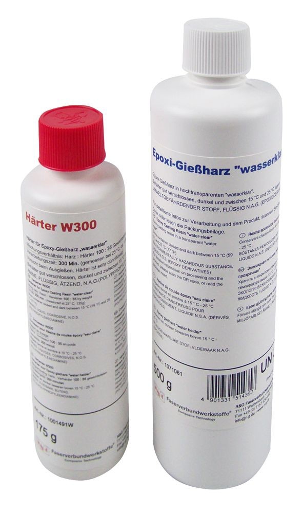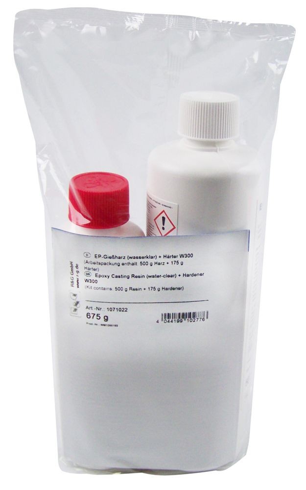 Epoxi-Gießharz (wasserklar) + Härter W 300, Packung/ 675 g. Hochtransparente, fast wasserklare Komponenten, gute UV-Beständigkeit, weitestgehend luftblasenfrei. Polierbare, harte Oberfläche. Sehr gute Schlagzähigkeit, geringe Schrumpfung. Lässt sich mit R&G-Universal-Farbpasten bzw. Transparentfarben und Trockenpigmenten aller Art einfärben und kann mit allen trockenen Füllstoffen modifiziert werden (Metallpulver, Effektpigmente, Sand, usw.). Ebenfalls geeignet für Beschichtungen und als Laminerharzsystem mit sehr langer Topfzeit.