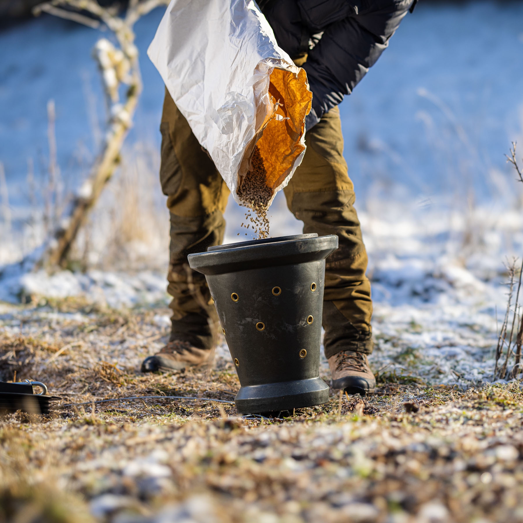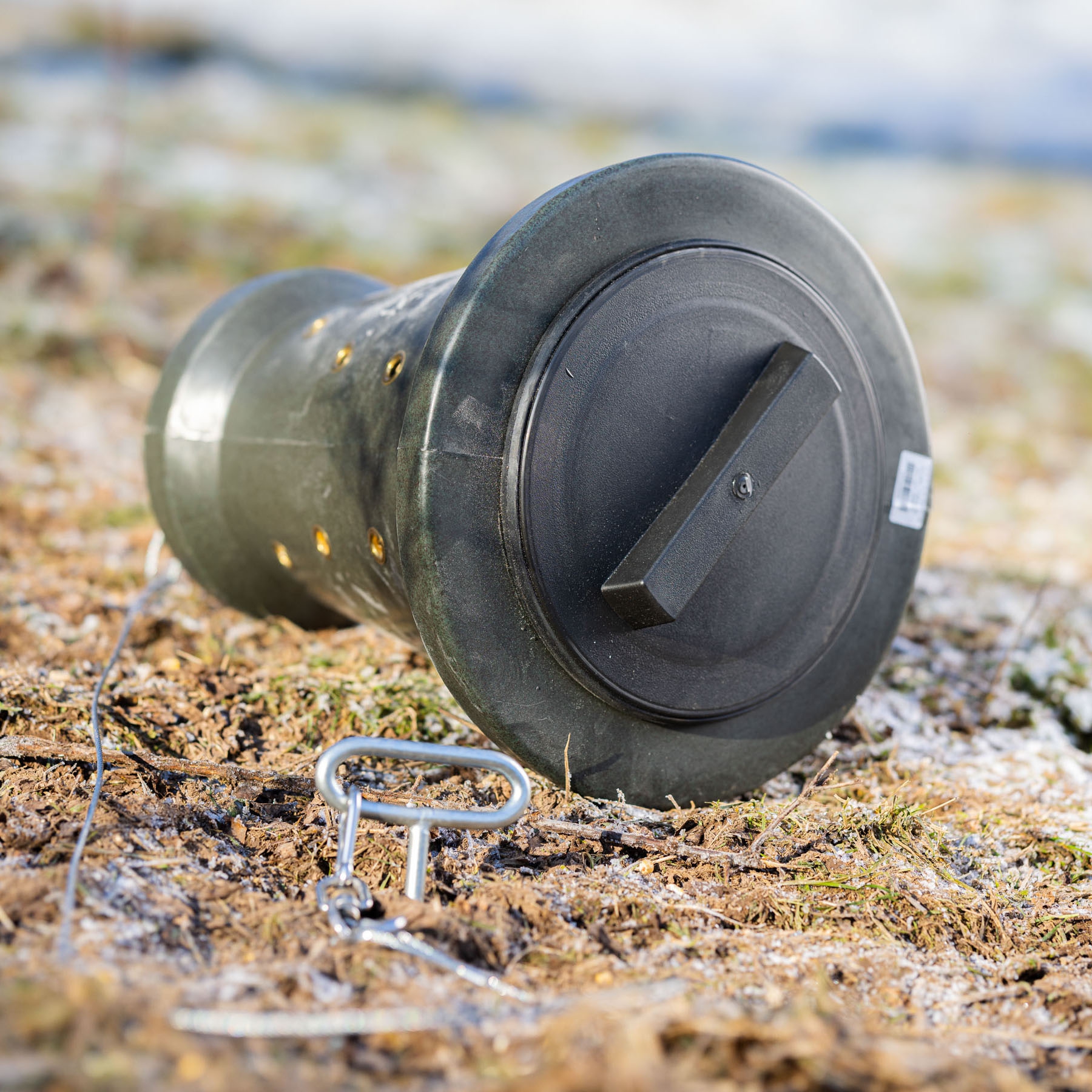 Futtertrommel, Kegelform 2.0, frostbeständig, mit 14 mm starken Löchern (mit Metallösen verstärkt) leicht zu befüllen dank ca. 20 cm Einfüllöffnung, bruch- und schlagzäh, für ca. 18 kg, Maße ca. 44x36x36 cm, Gewicht ca. 2 kg. Inkl. Bodenanker und Befestigungsseil.
