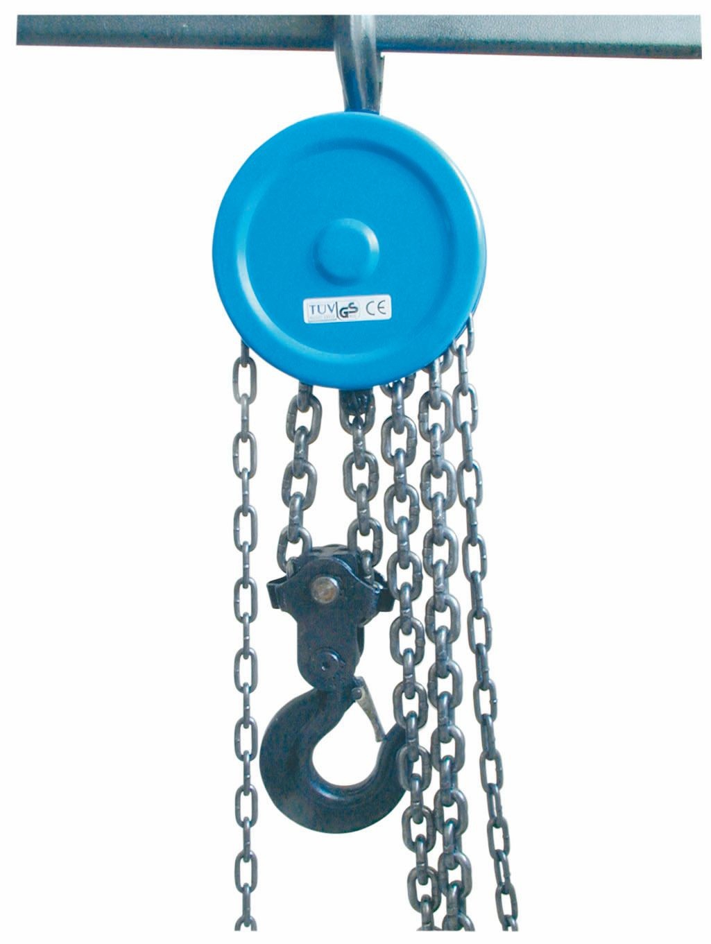 Kettenflaschenzug 1t GS geprüft, mit 2,5 m Kette, nutzbare Hubhöhe 230cm, zum Heben von Lasten bis 1000kg, lackiertes Gehäuse, geschmiedete Haken. Der ideale Helfer beim Aufbau schwerer Reviereinrichtungen. Eigengewicht 8,5kg, Mindestabstand Haken zu Haken 33cm.