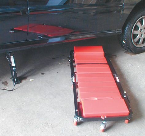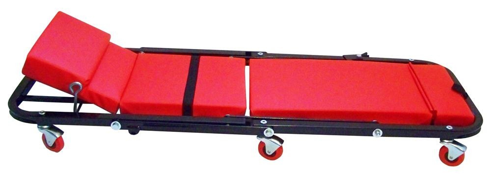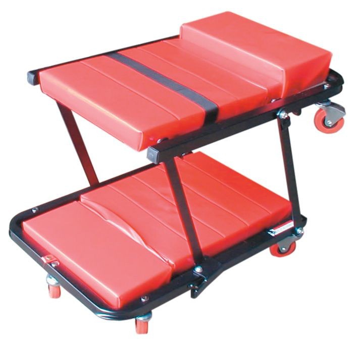 Montagerollbrett und Rollsitz 2in1, hochwertige Profi-Ausführung mit 3 Trägern für bequemes Arbeiten unter oder am Auto. Die stabile Rahmenkonstruktion ist für Gewichte bis 120 kg geeignet. Bequeme Auflagefläche mit separatem Kopfpolster (5fach verstellbar) aus abwaschbarem Kunstlederbezug. Die ölbeständigen 7 Laufrollen mit 2" Drehlager gewährleisten auch unter Belastung einwandfreie Funktion. Abm. (L x B x H) 120 x 41 x 14 cm. Kopfpolster ca. 10 cm hoch. Mit zwei Handgriffen zum Rollsitz aufgeklappt, Sitzhöhe 40 cm, Sitzlänge 54 cm, Gewicht ca. 13 kg