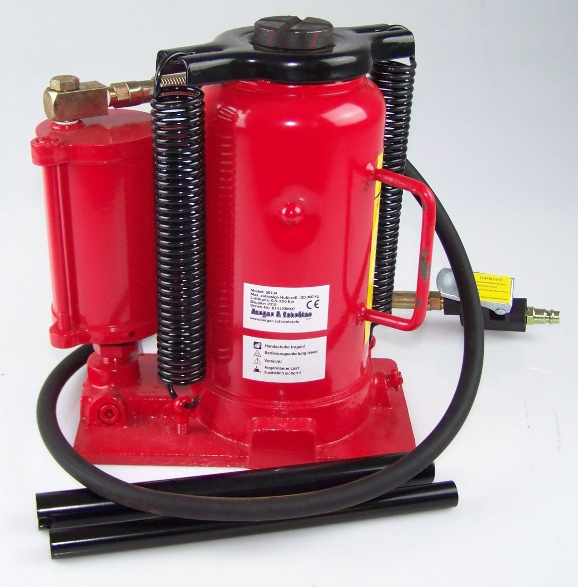 Luft-hydraulischer Wagenheber, bis 20 to heben, ohne selbst pumpen zu müssen; einfach an den Kompressor anschließen, mit Luftdruck von ca.8 bar schnell hydraulisch heben. Hubhöhe bis 510 mm, minimale Höhe 265 mm, Gewicht nur 18 kg, Maße ca. HxBxT = 29x19x28 cm, manuelles hochpumpen möglich, superschnelles einfahren des Hydraulikzylinders über Federmechanismus, Druckschlauch ca. 1m lang.