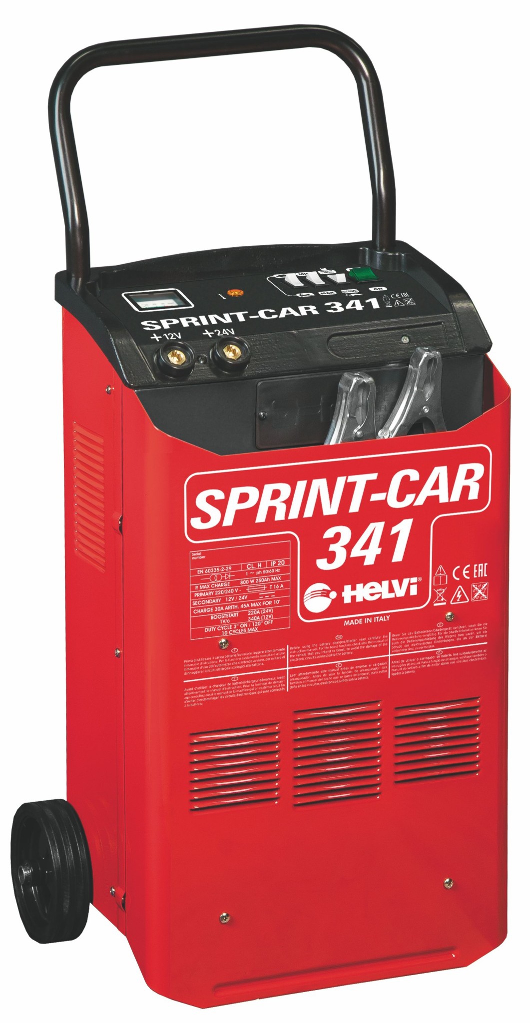 Professionelles Batterieladegerät mit Starthilfe. In fahrbarer Ausführung mit Handgriff für leichten Transport.