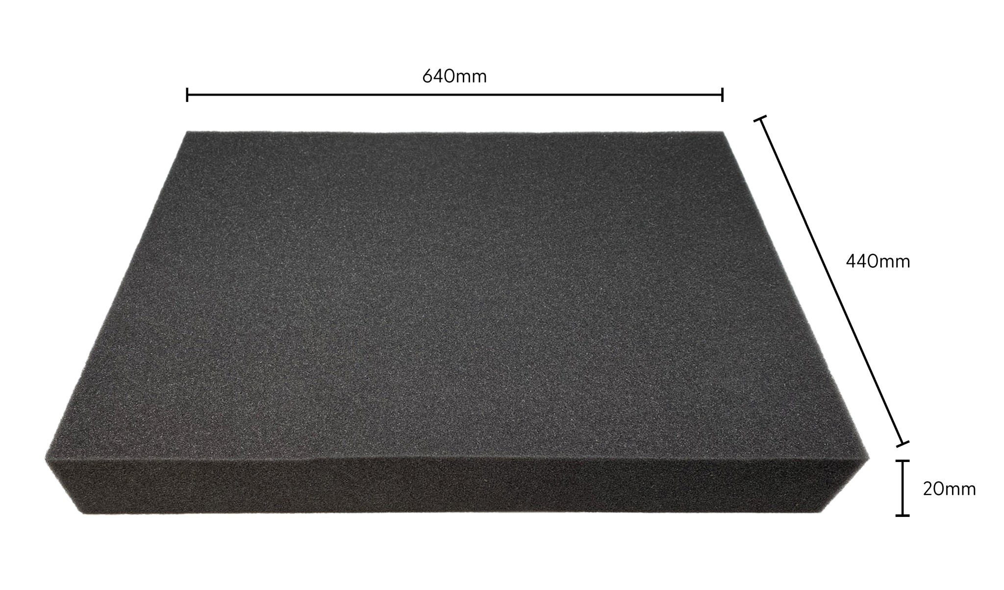 Schaumstoff 640 x 440 x 20 RG2540, vielfältige Anwendung z.B. als Einlage für Werkzeugkästen, Koffer etc, Sitzpolster, Auspolsterung. Farbe anthrazit. Maße: 640x440x20 mm