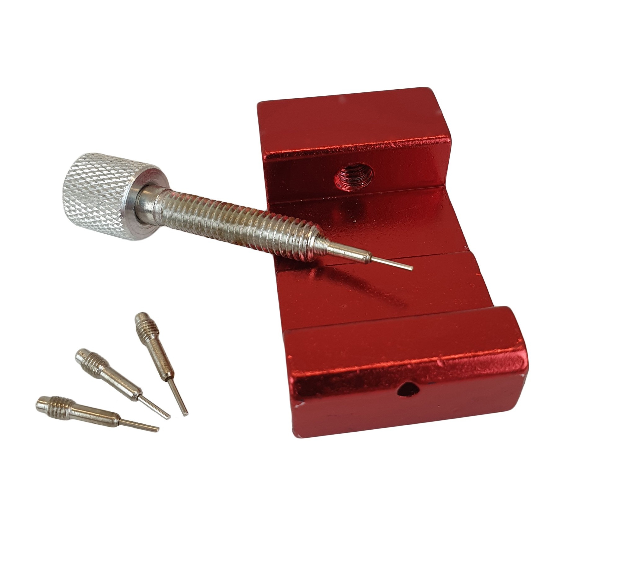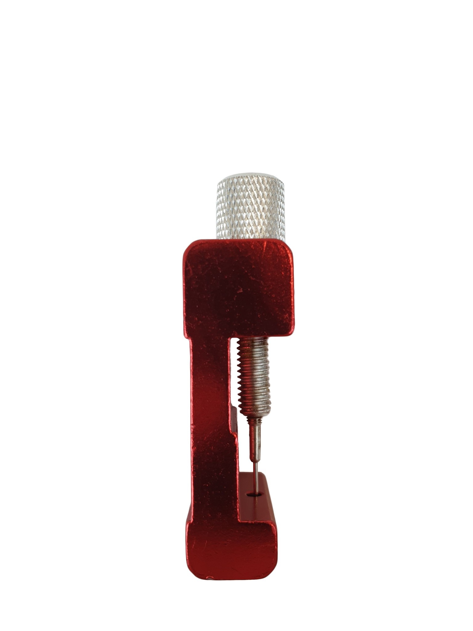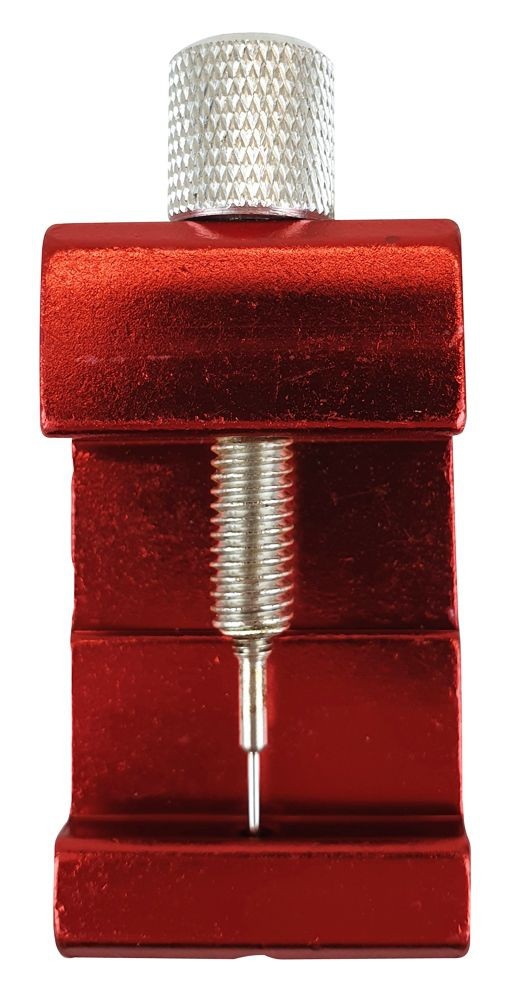 Stiftausdrücker für Rollenarmbänder bis 25 mm Breite, aus Aluminium, mit Hartmetallaustreiber 0,8 mm Durchmesser (incl. 2 Stck. Ersatzaustreibern), Vortrieb über Gewinde