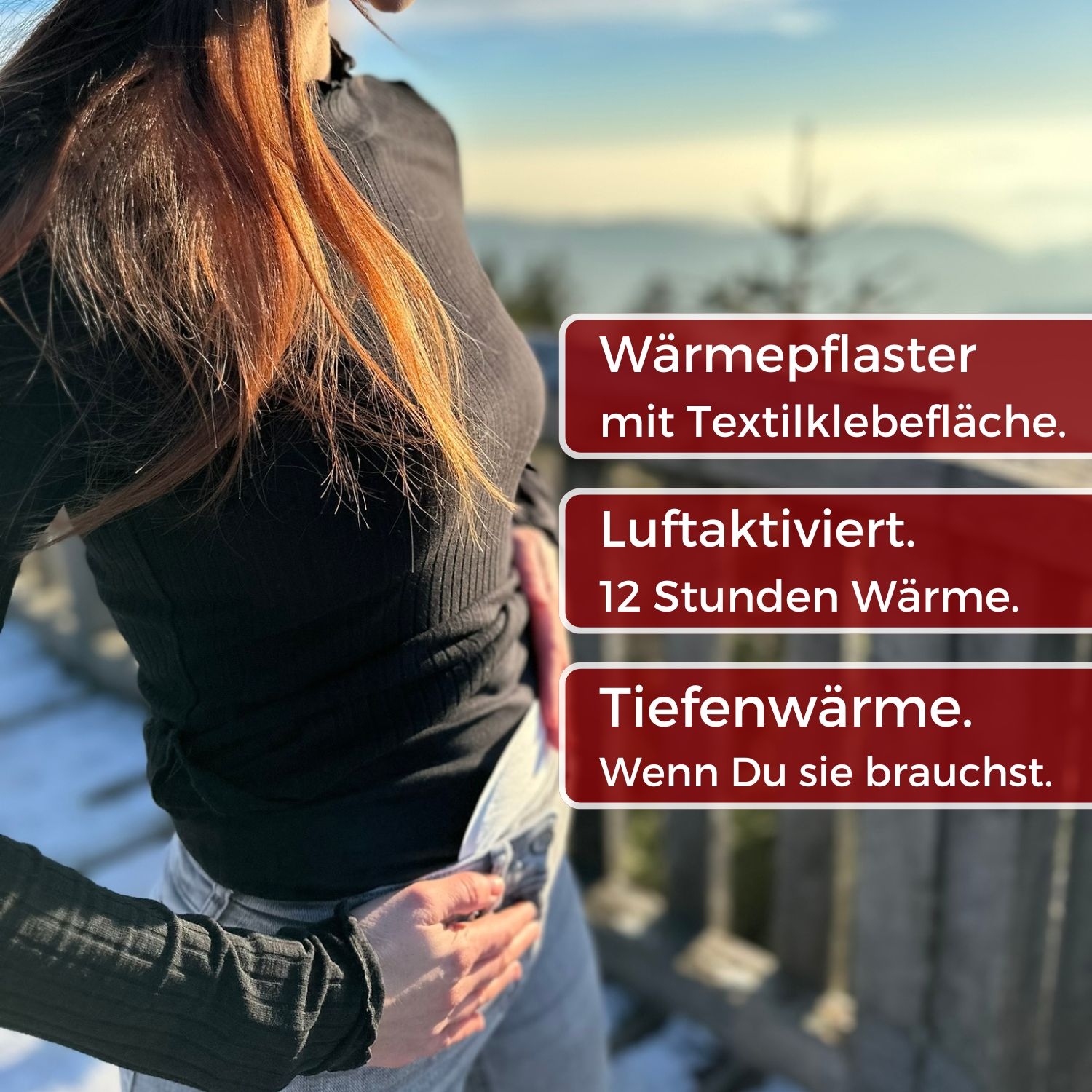 Dezent unter der Kleidung tragbare Wärmeauflage in perfekter Passform für Unterleib oder Bauch. Mittels Klebefläche kann das Wärmepflaster direkt auf der Haut oder auf der Kleidung angebracht werden. Nach Öffnen der Verpackung entwickelt sich nach einigen Minuten eine spürbare für ca. 12 Stunden. Gezielte Wärme wo sie gut tut.