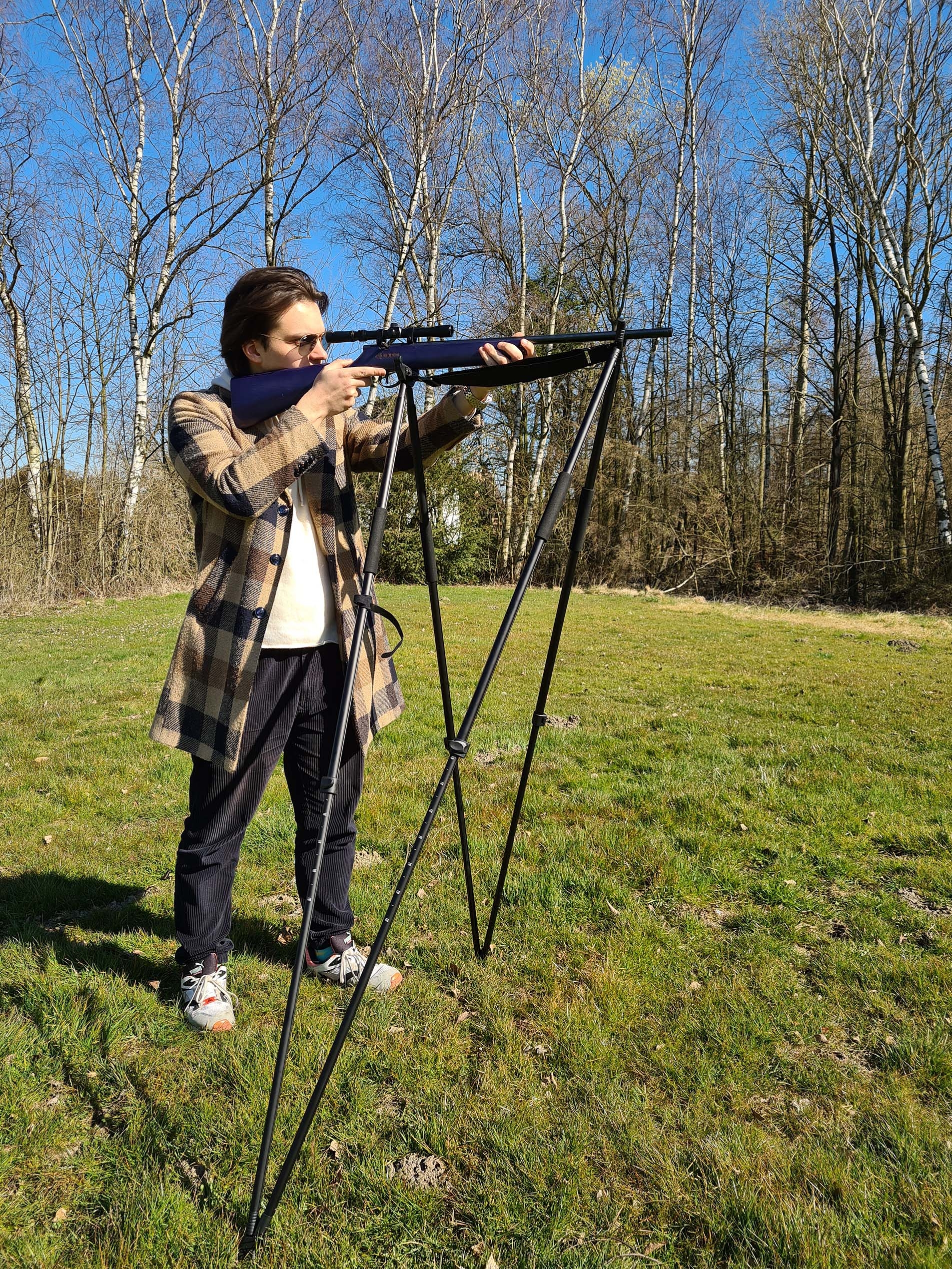 Alu-Zielstock, vierbeinig, stufenlos einstellbar durch Telekoptechnik (118 - 180 cm), Zielgabel und Auflage, auch als Auflage für Foto oder Spektiv verwendbar. Leicht zu tragen, geringes Gewicht von nur ca. 1200 g.