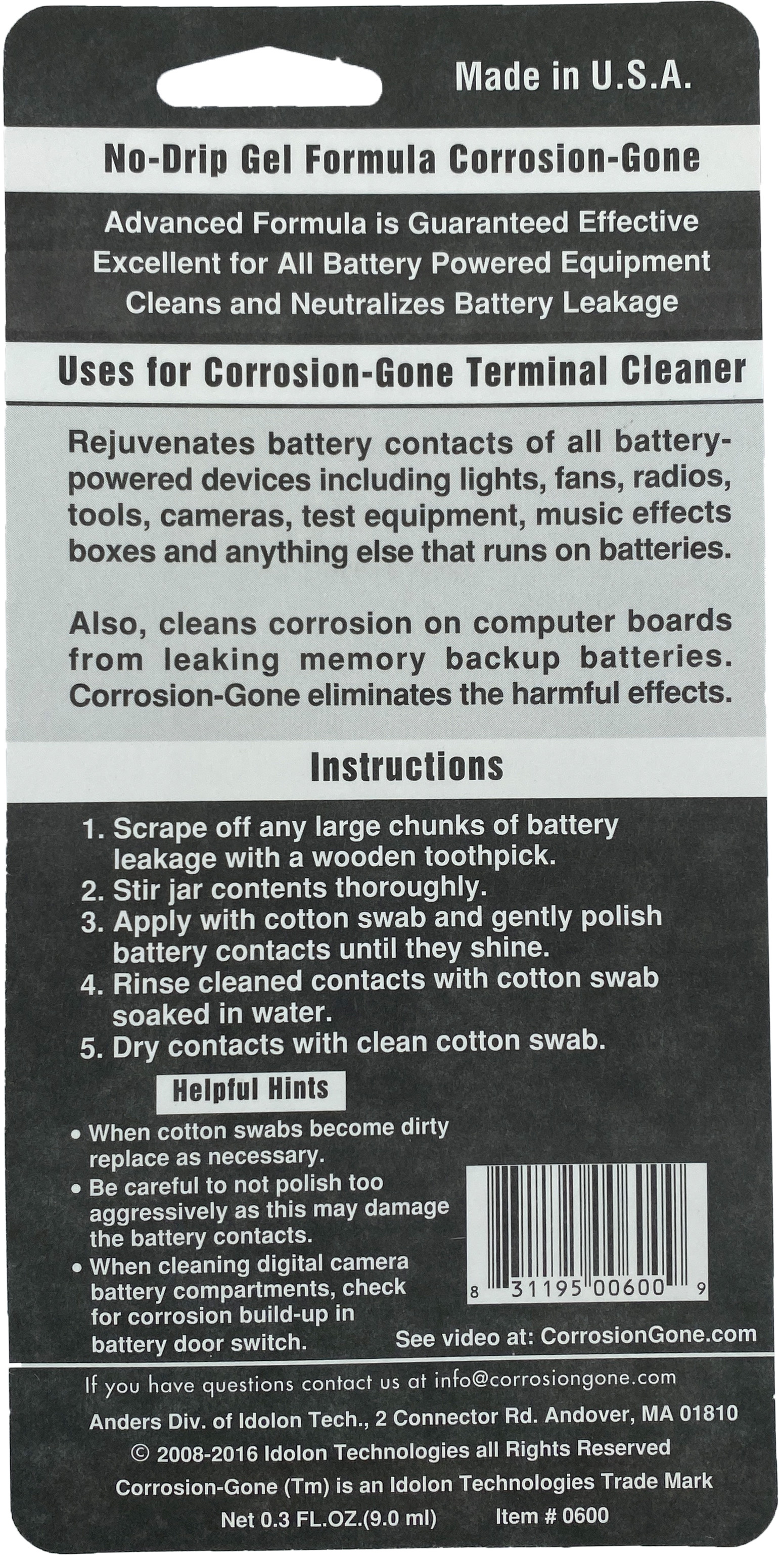 Mit einer einzigen Dose Corrosion Gone können Sie viele elektronische Haushaltsgeräte wieder auf Vordermann bringen, von batteriebetriebenem Spielzeug über Digitalkameras, Testgeräte und tragbare Radios bis hin zu allem, was mit Batterien betrieben wird. Corrosion gone kann die Lebensdauer Ihrer Elektronik verlängern und somit Nachhaltigkeit unterstützen, Korrossionen an Batterie/Akkupolen, an Batteriefedern im Batterie/Akkufach werden angelöst und können abgewischt/poliert werden, für alkaline Zellen (nicht für Säurezellen) geeignet, 9ml, Made in USA.
