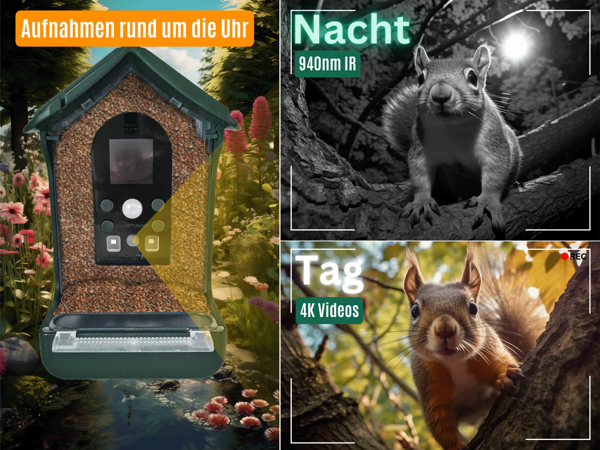 automatic photos and videos of your garden birds, observed during feeding or watering, with PIR (up to 3m) motion detector, pictures in colour during the day, black and white at night via IR (infrared) with 940nm. 100° objectif,
