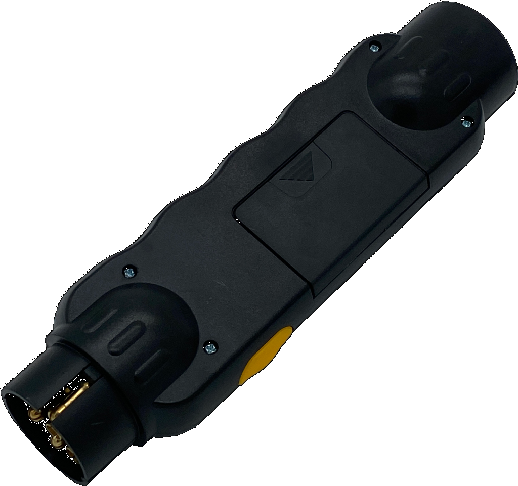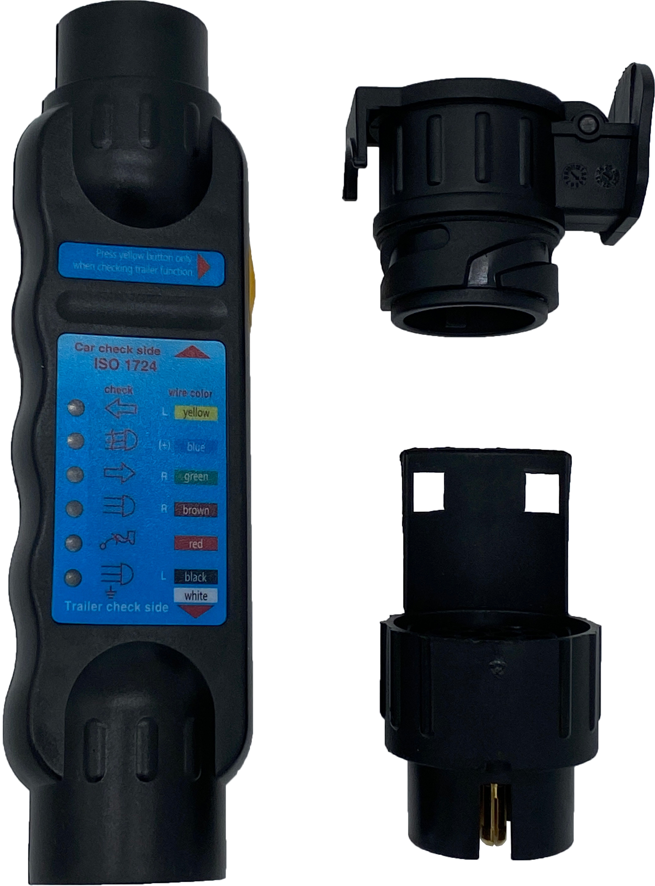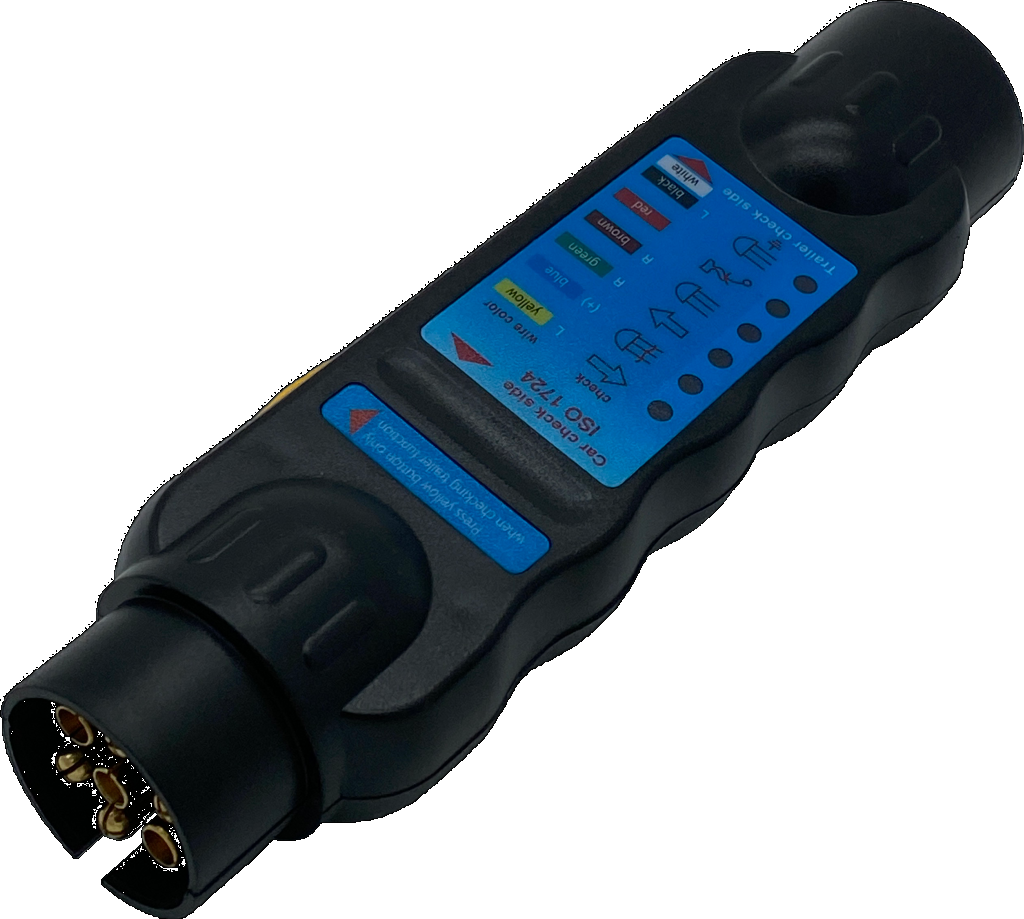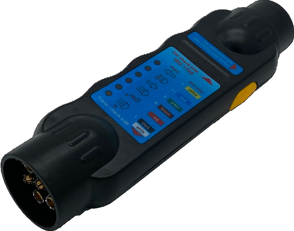LED Trailer tester with adaptors for 7-and 13 pin socket/plugs. Shows malfunfction of any contact in the 7 or 13 pin trailersocket and plugs. 9 V power supply by block battery (not included)