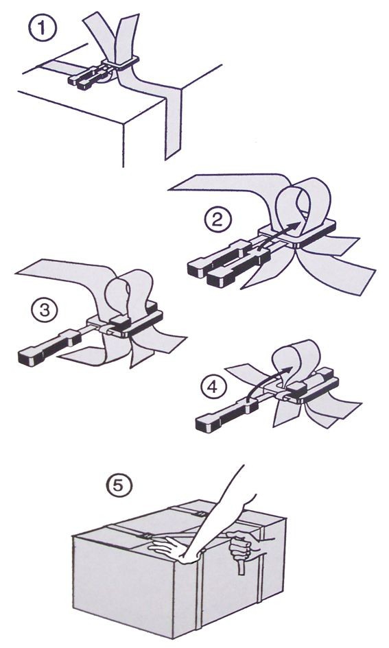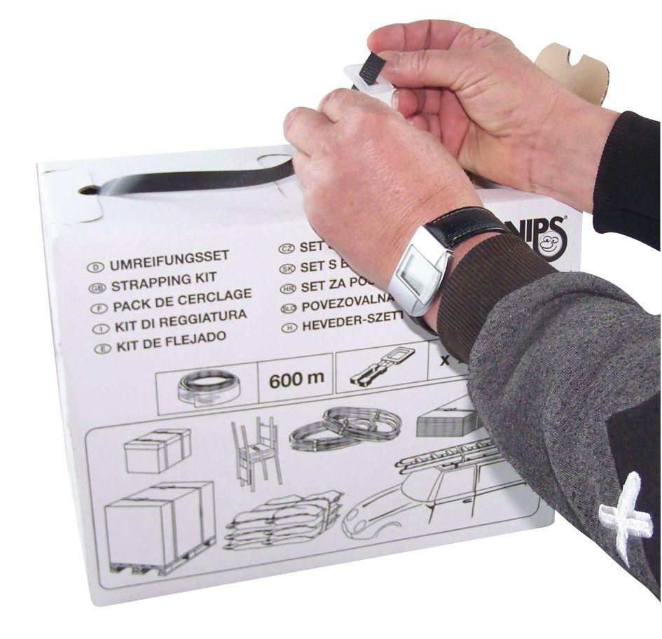 - Strapping strap and sealing clamps for secure strapping always ready to hand in a box