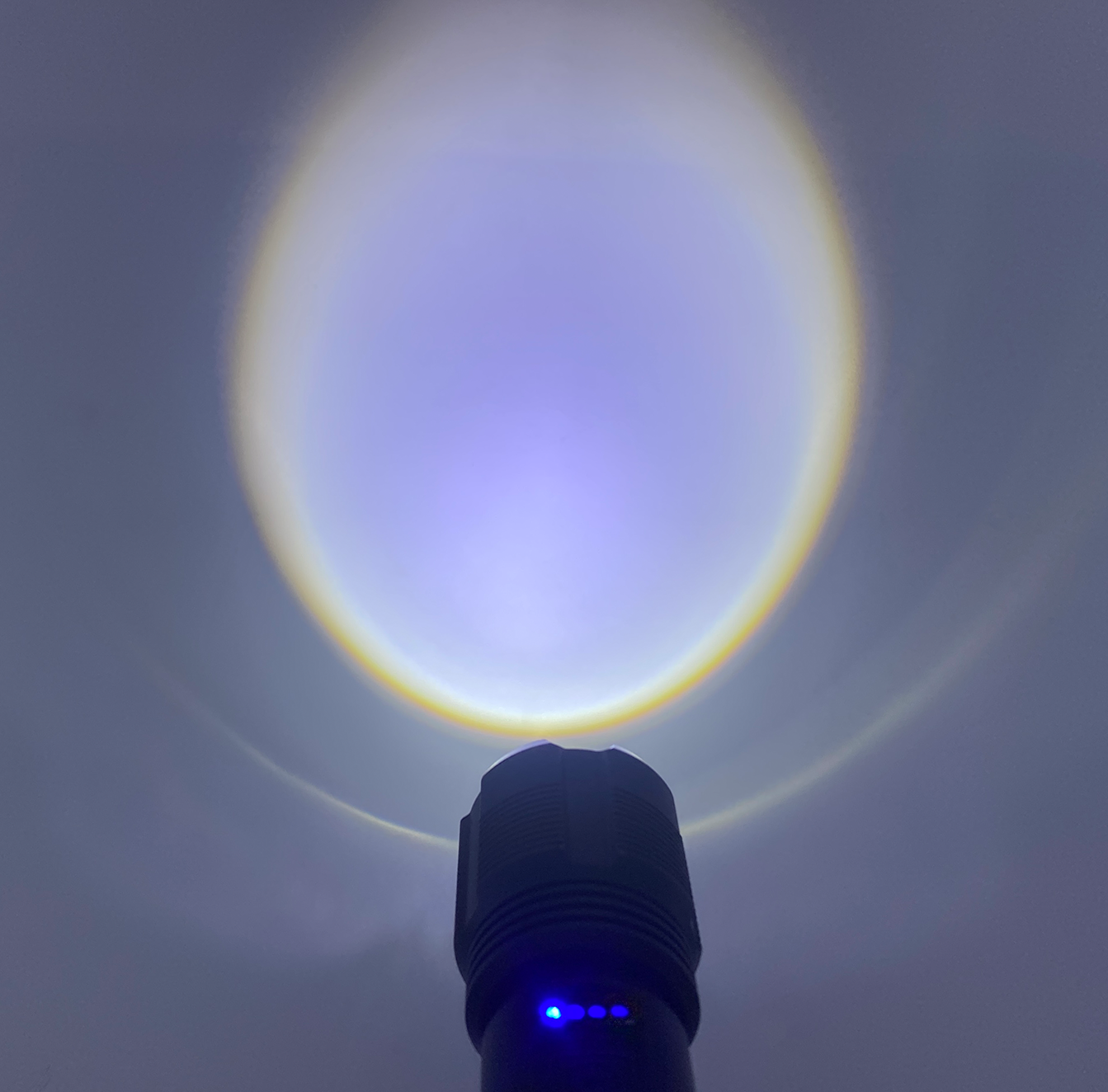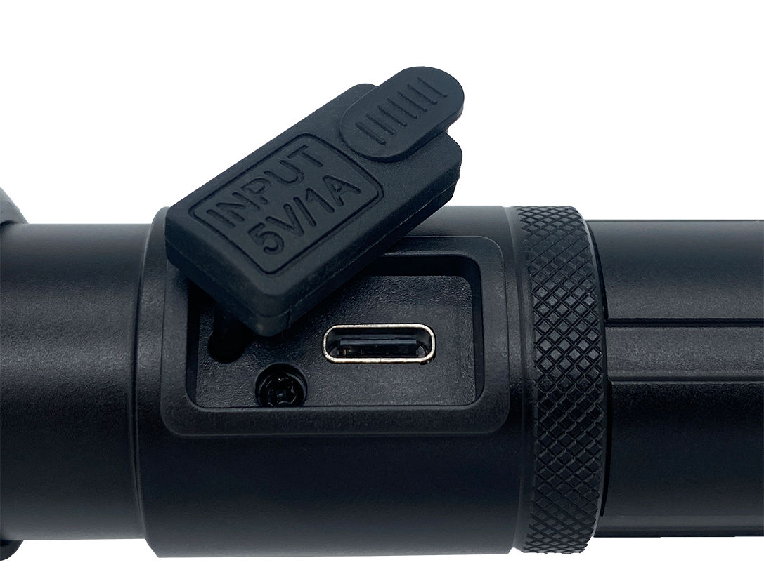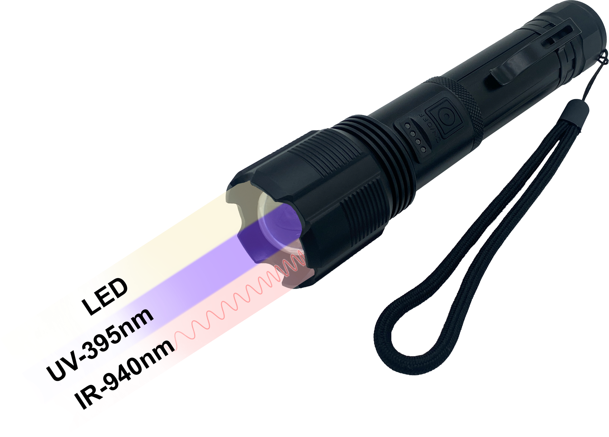 The ON / OFF switch allows you to choose between LED white light, IR-940nm light or UV-395nm light. The LED charge status indicator shows you the charge status of the 18650 battery.